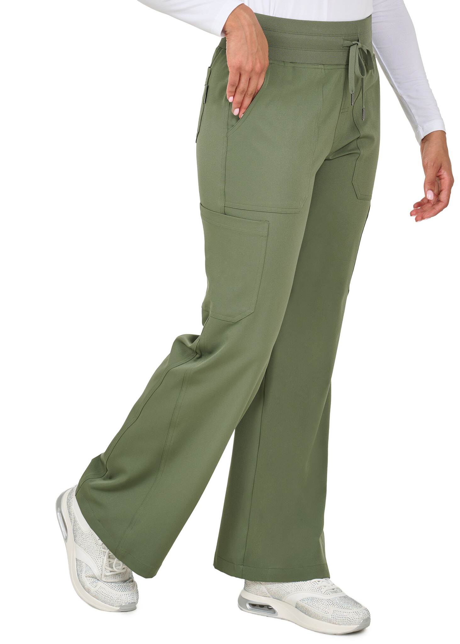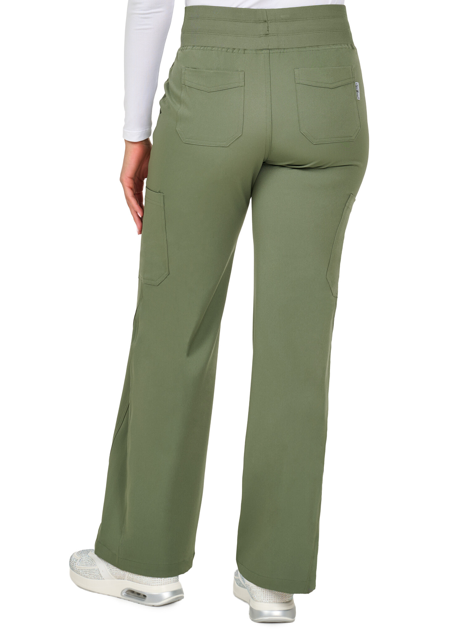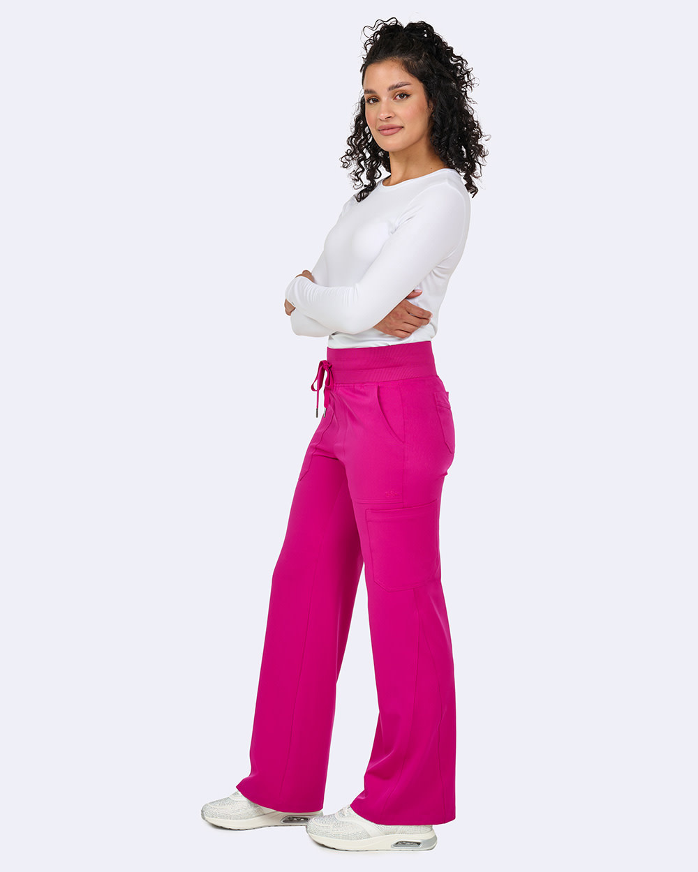 Flare with flair! These high-waisted pants feature a comfy rib-knit waistband, heart-arrow logo, and pockets galore—front, back, and cargo. The wide-leg design with a triangle inset adds a bold twist to your everyday scrubs. Cute, comfy, and functional!