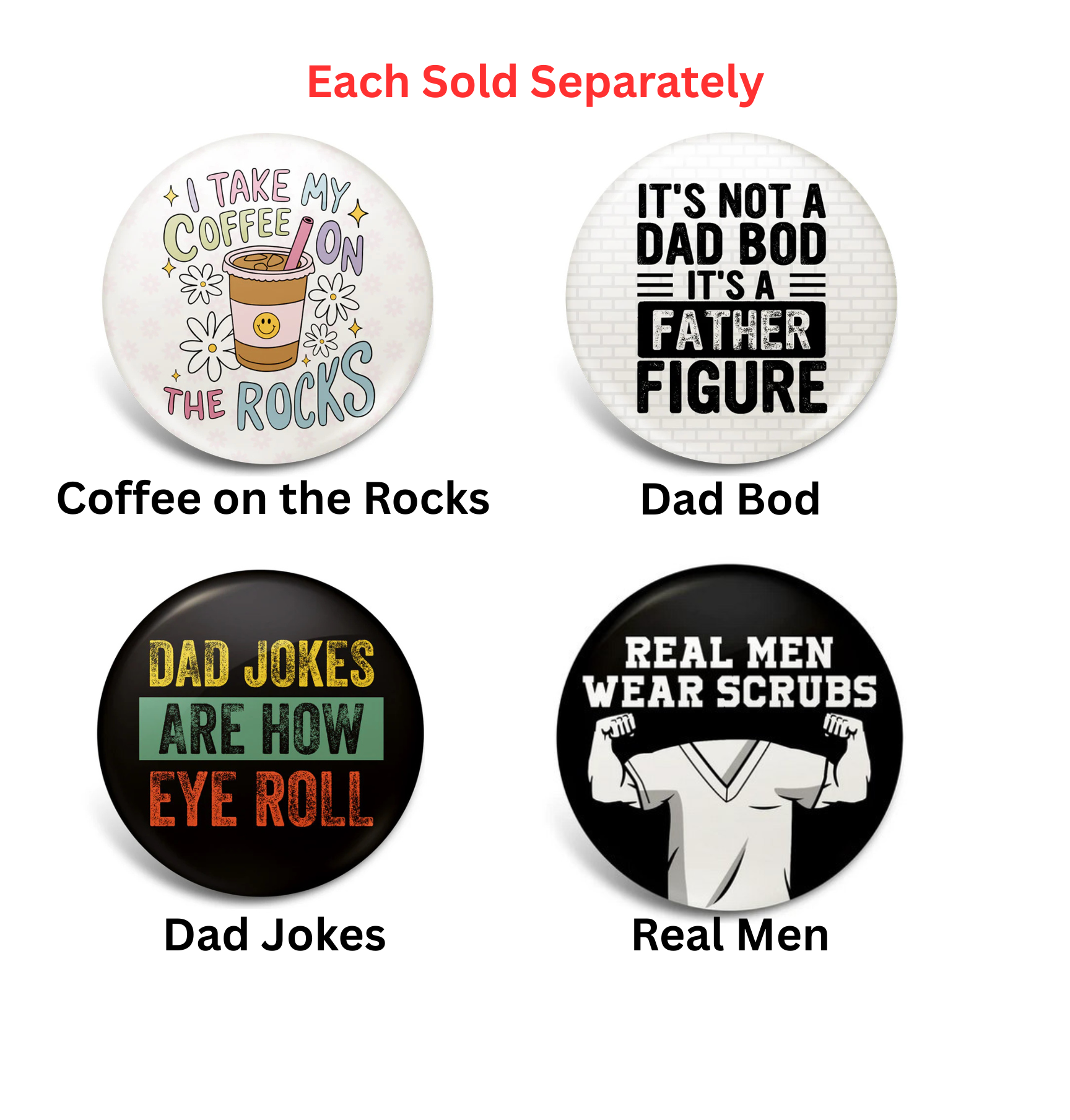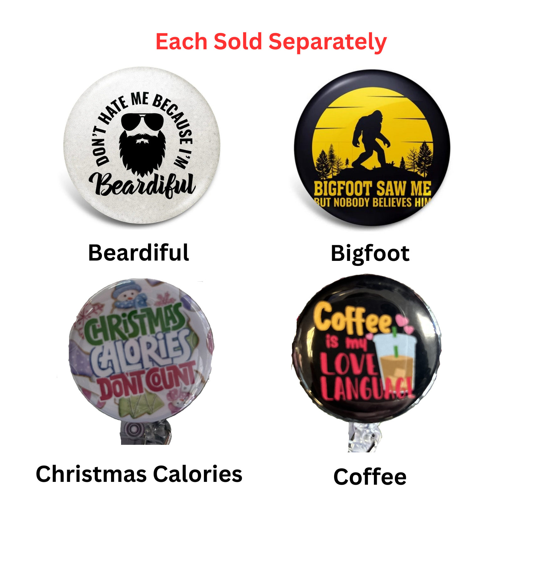 Permanently mounted on an alligator rotating clip badge reel and sold as a set. Button measures 1.5" in diameter.