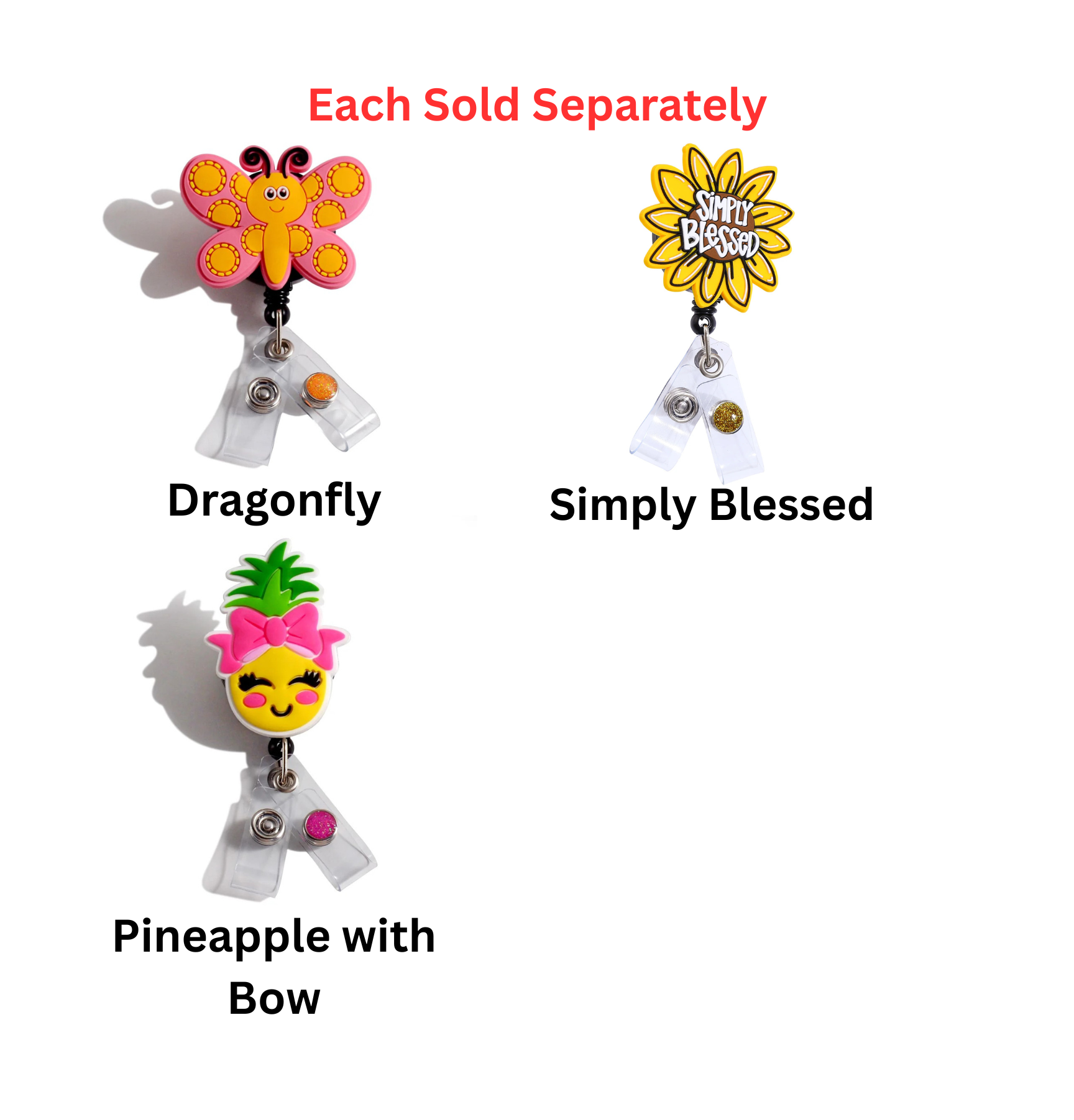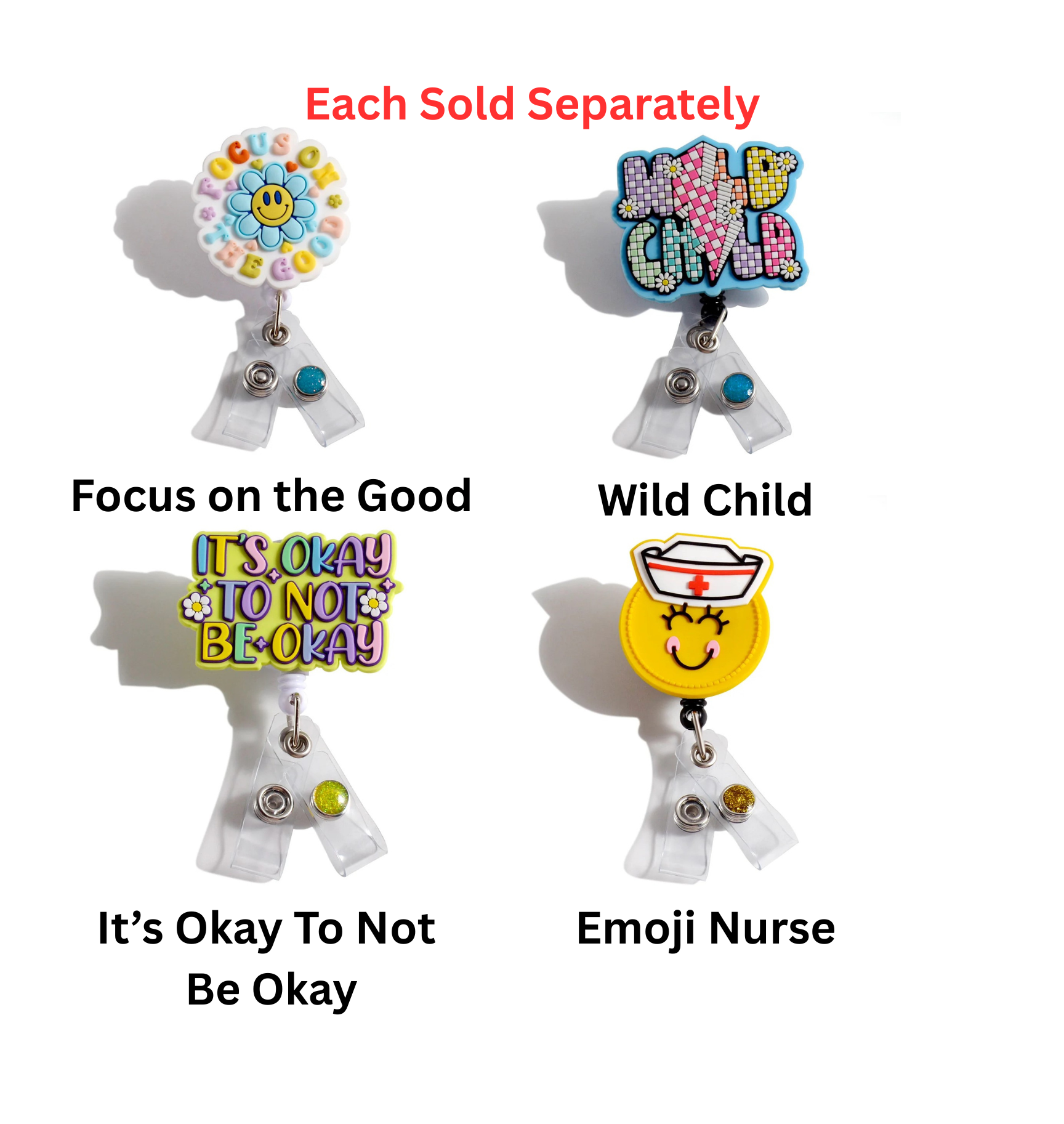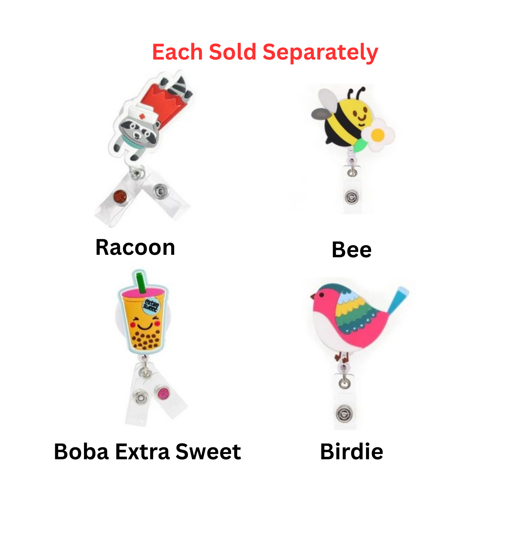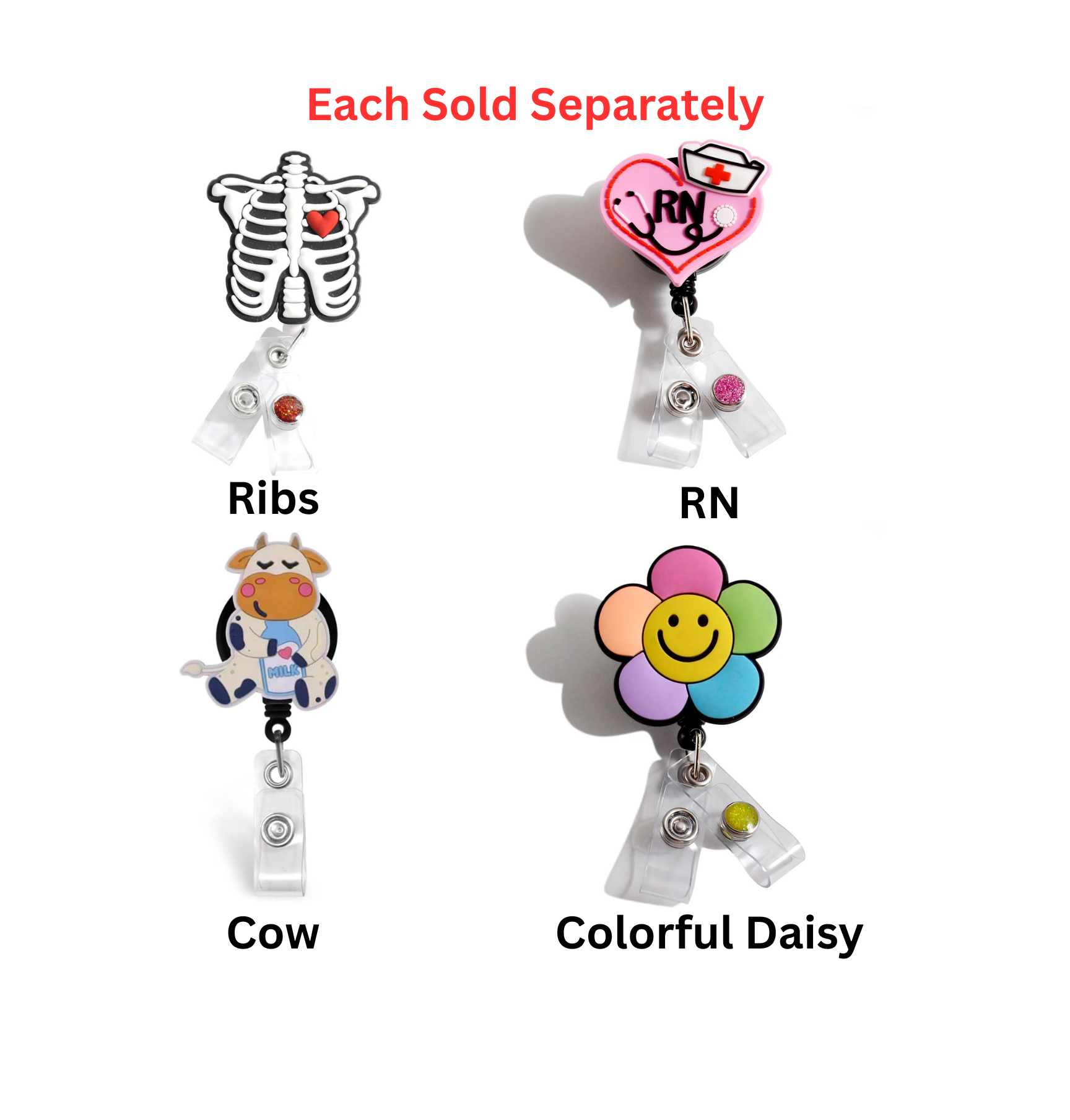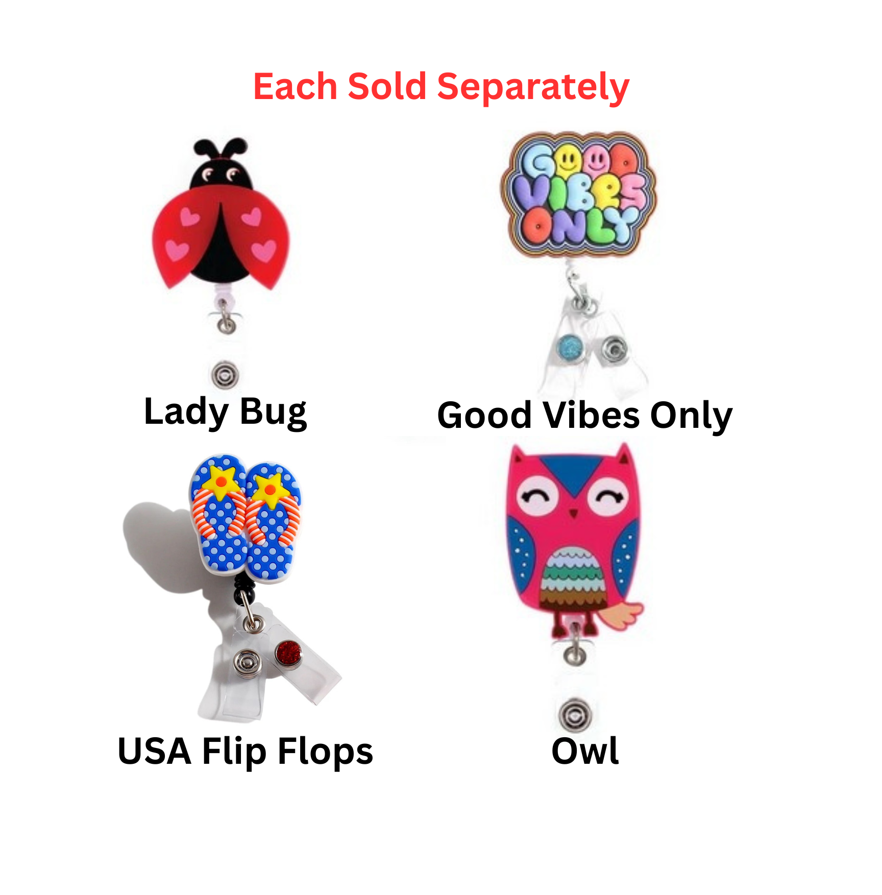 Happy, colorful, and outright adorable designs are made into these fun rubbery tops that are permanently attached to our quality swivel alligator clip badge reel.