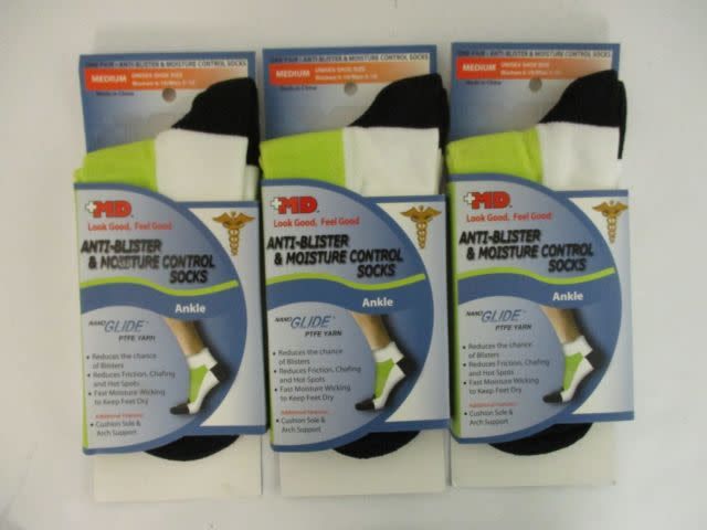- +MD Anti- Blister & Moisture Control Socks with PTFE NanoGlide wick away sweat, drying quickly and reducing friction; resulting in fewer hot spots and a reduced chance for blistering.