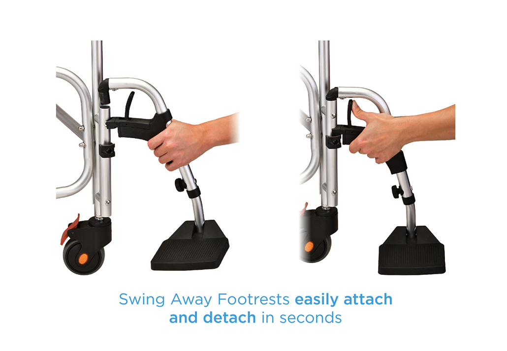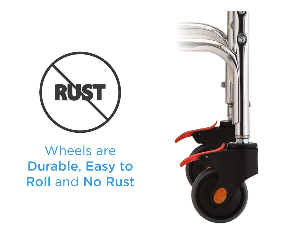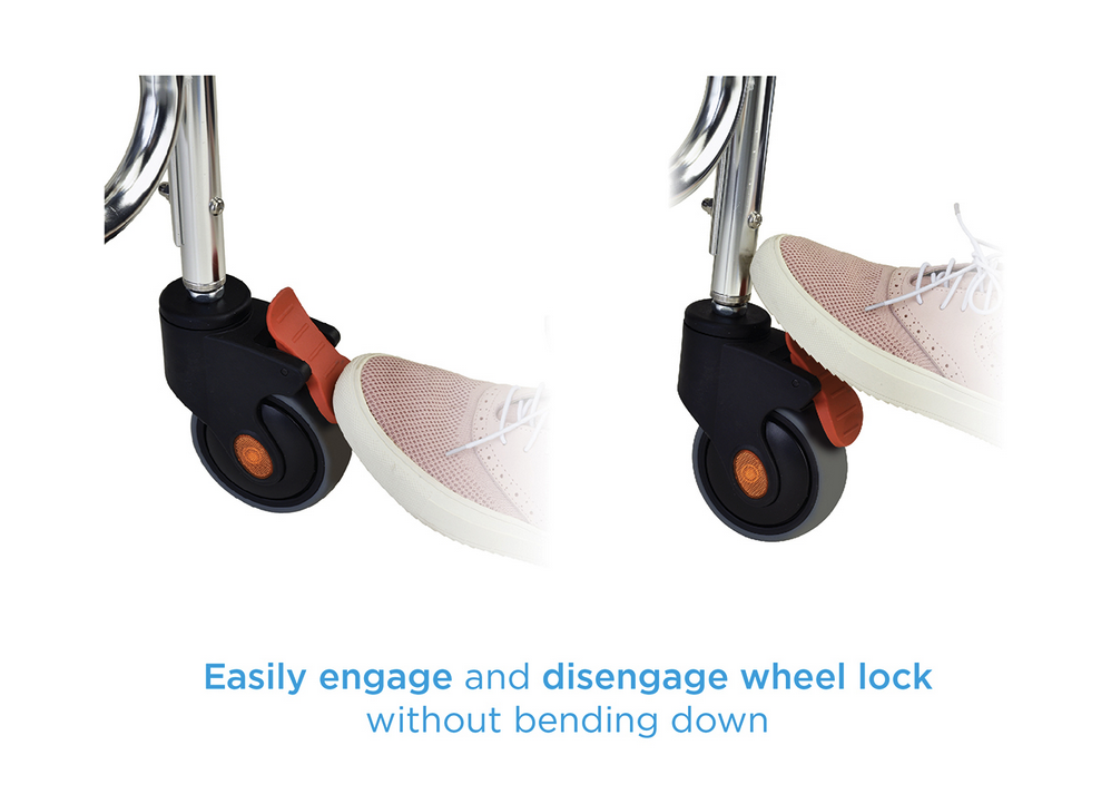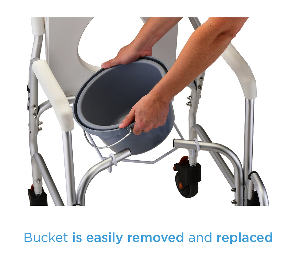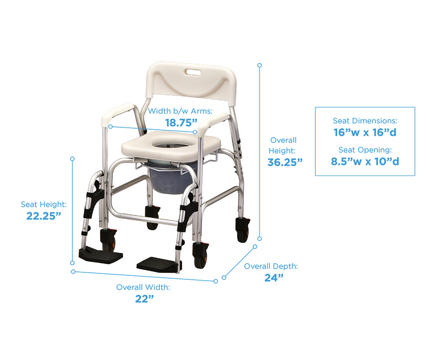 The Deluxe Shower Chair and Commode (8801) is designed with waterfall armrests and a padded seat. It has removable swing-away footrests along with four 4" swivel-lock casters, for maneuverability and secure positioning. The bucket and lid are included.