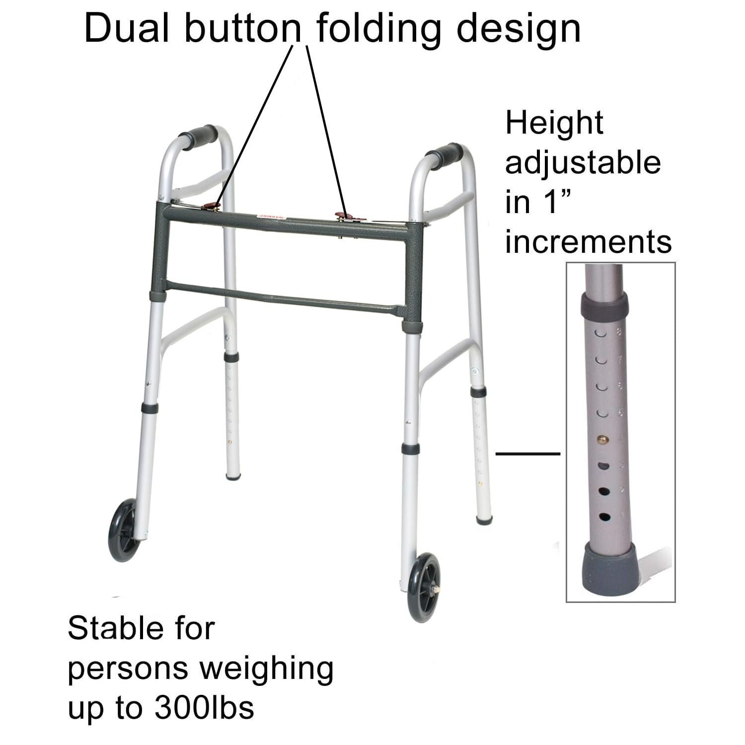 The ProBasics Two-Button Release Folding Walker offers strong, lightweight aluminum support with easy height adjustment and a user-friendly folding design. Its durable build and limited lifetime warranty make it ideal for daily use and reliable mobility.