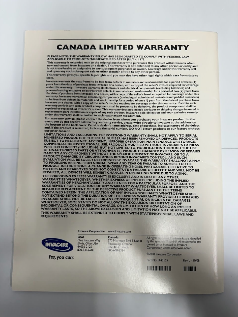 Used Invacare Owner's Manual for Formula CG Powered Lift Chairs