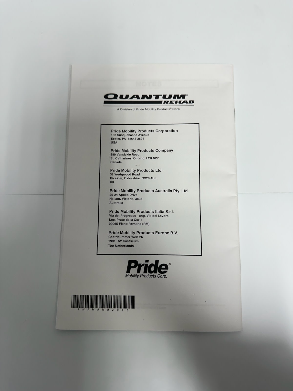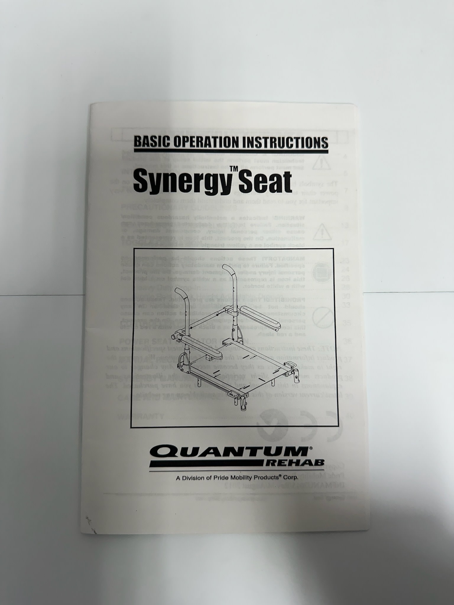 Used Pride INFMANU2015 Basic Operation Instructions Manual for Synergy Seats