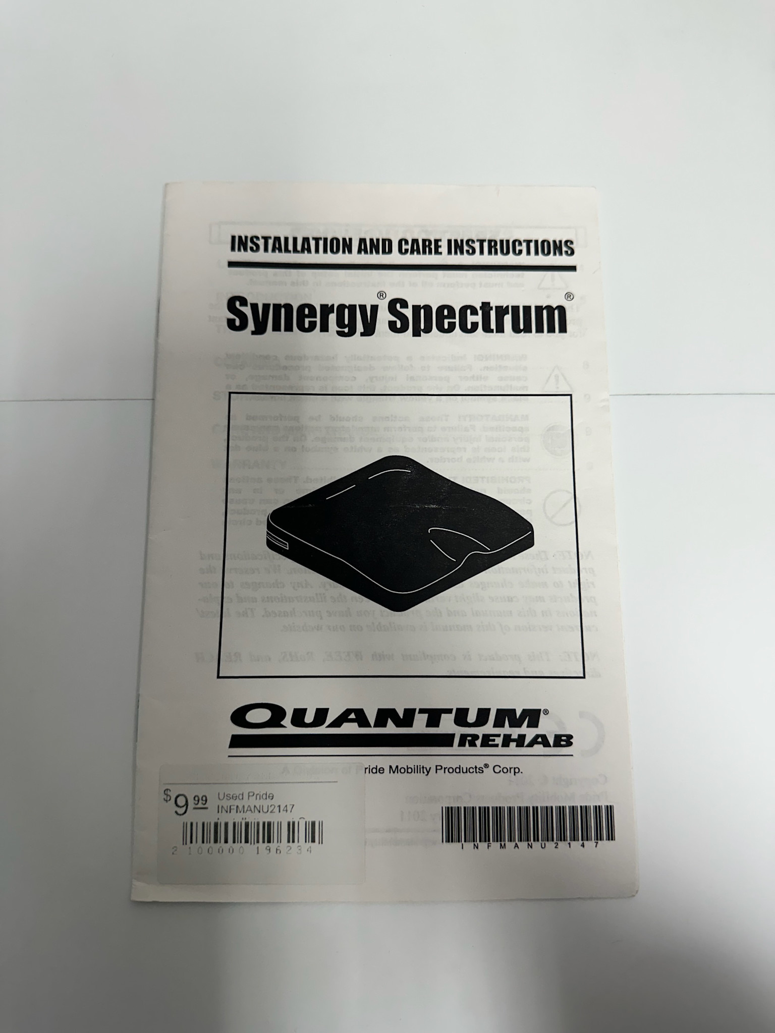 Used Pride INFMANU2147 Installation and Care Instructions Manual for Synergy Spectrum Seat Cushions